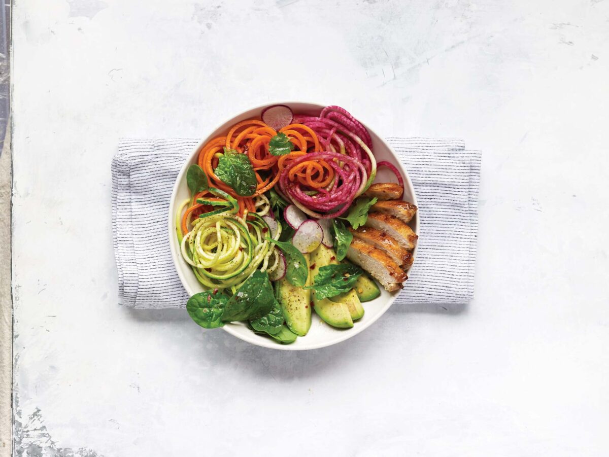 - Divide spinach and avocado among four bowls. Top with chicken, zucchini, carrots, radishes and cilantro. Drizzle with dressing and serve immediately.