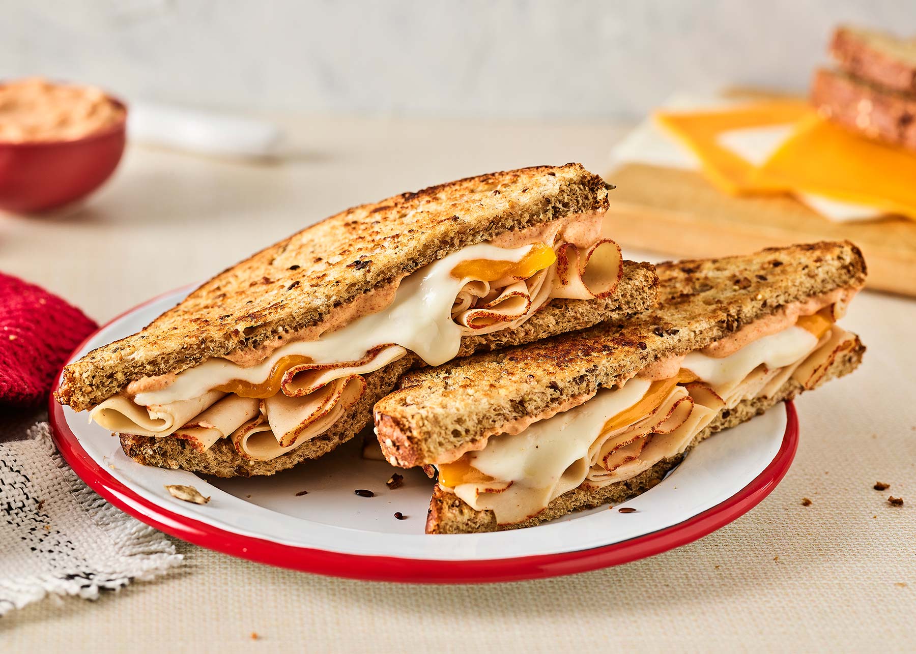 • To make powerhouse sauce: Mix Greek yogurt, Dijon mustard, garlic powder and smoked paprika until well blended. Slice sandwich in half and drizzle with Powerhouse sauce.
